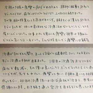 発症後6年で当院を受診されました。特に仕事などで強いストレスがかかった時にけいれんが激しくなりました。来院された時には殆ど目を開けない状態で、顔面が引き攣って、顔が歪んで見えました。顔面に浮腫ができてめまいがあり、患った側の顔が痒く、舌が腫れるなどの症状が起きていました。半分は諦めの気持ちだったとのことですが、10回の治療が終わる頃には症状が目に見えて軽くなってきました。完治を図るため、さらに10回通っていただきました。その後は再発もなく、笑顔が戻りました。